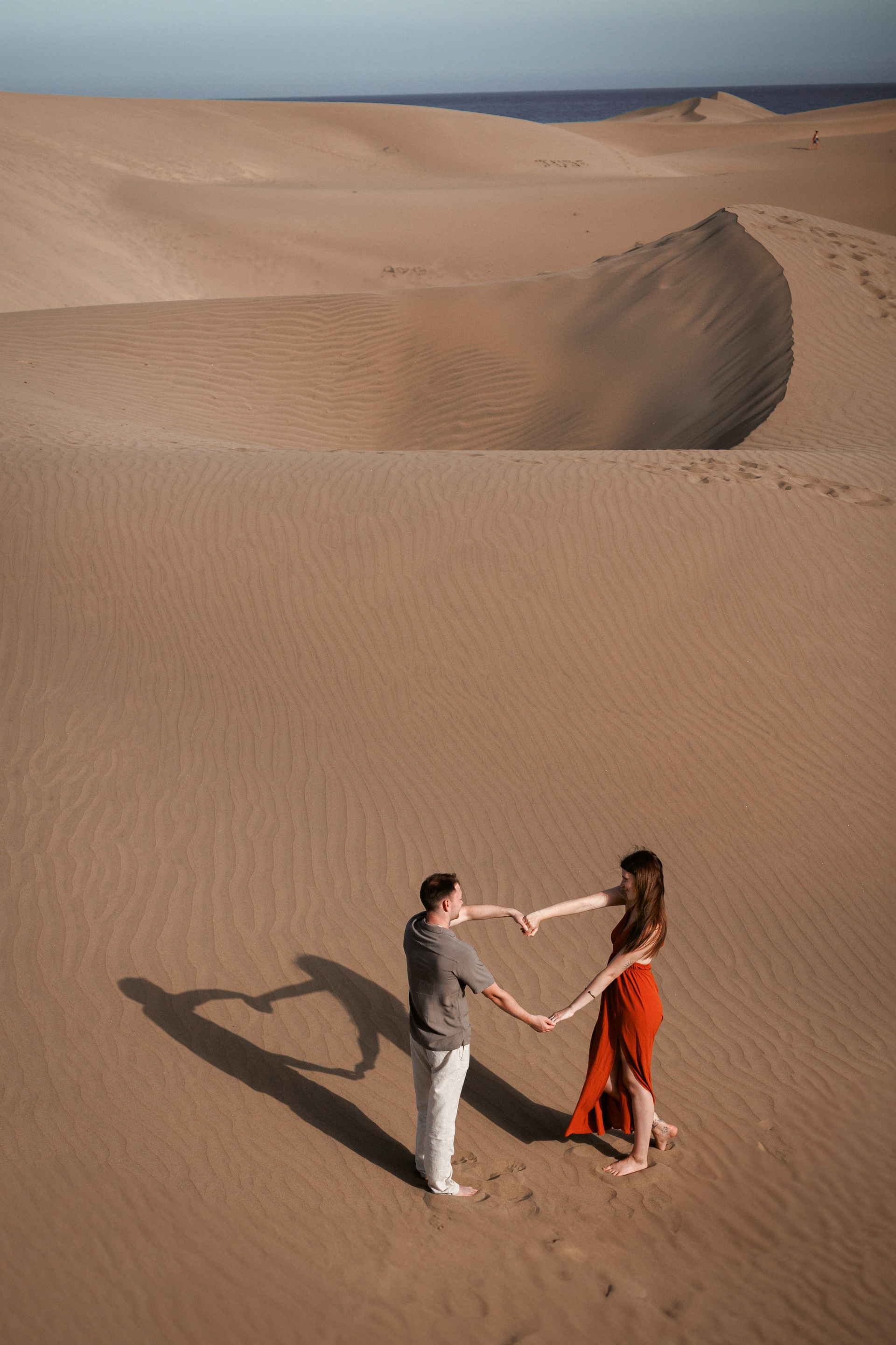 I therefore decided to be a couple photographer in Dunas Maspalomas making good use of my creative vision for romance shots. I like to fine-tune between the magnificent natural backdrop of the dunes and the closeness between partners. I tend to shoot with the golden hour light to create a dreamy effect, and I place the couples in positions to frame their figure against the sun as it sets. And I also love the textures and patterns the sand creates, and use this further in framing and placing couples in interesting shapes.