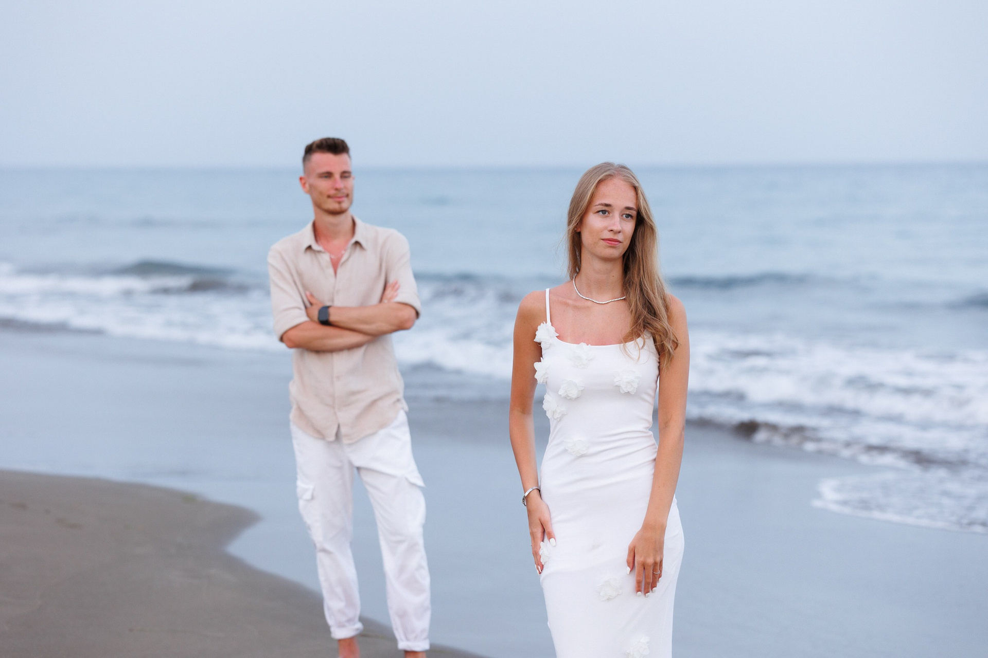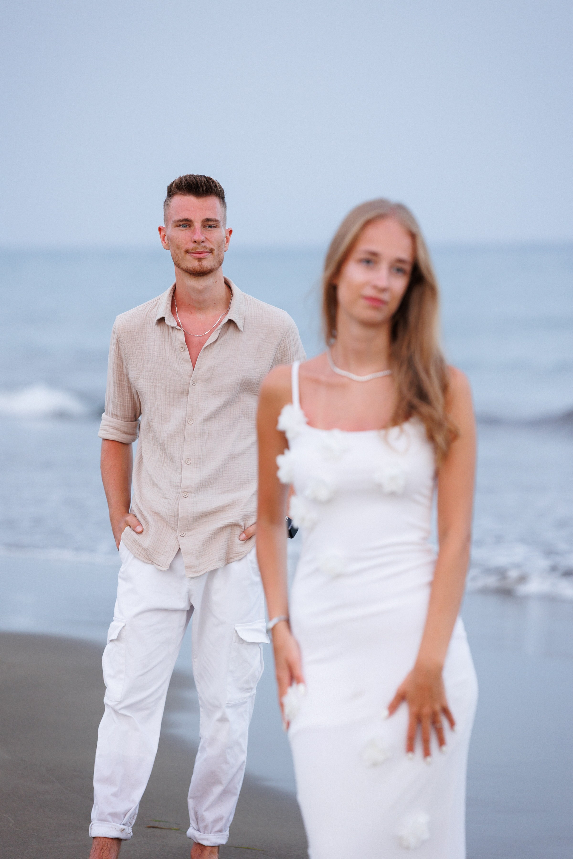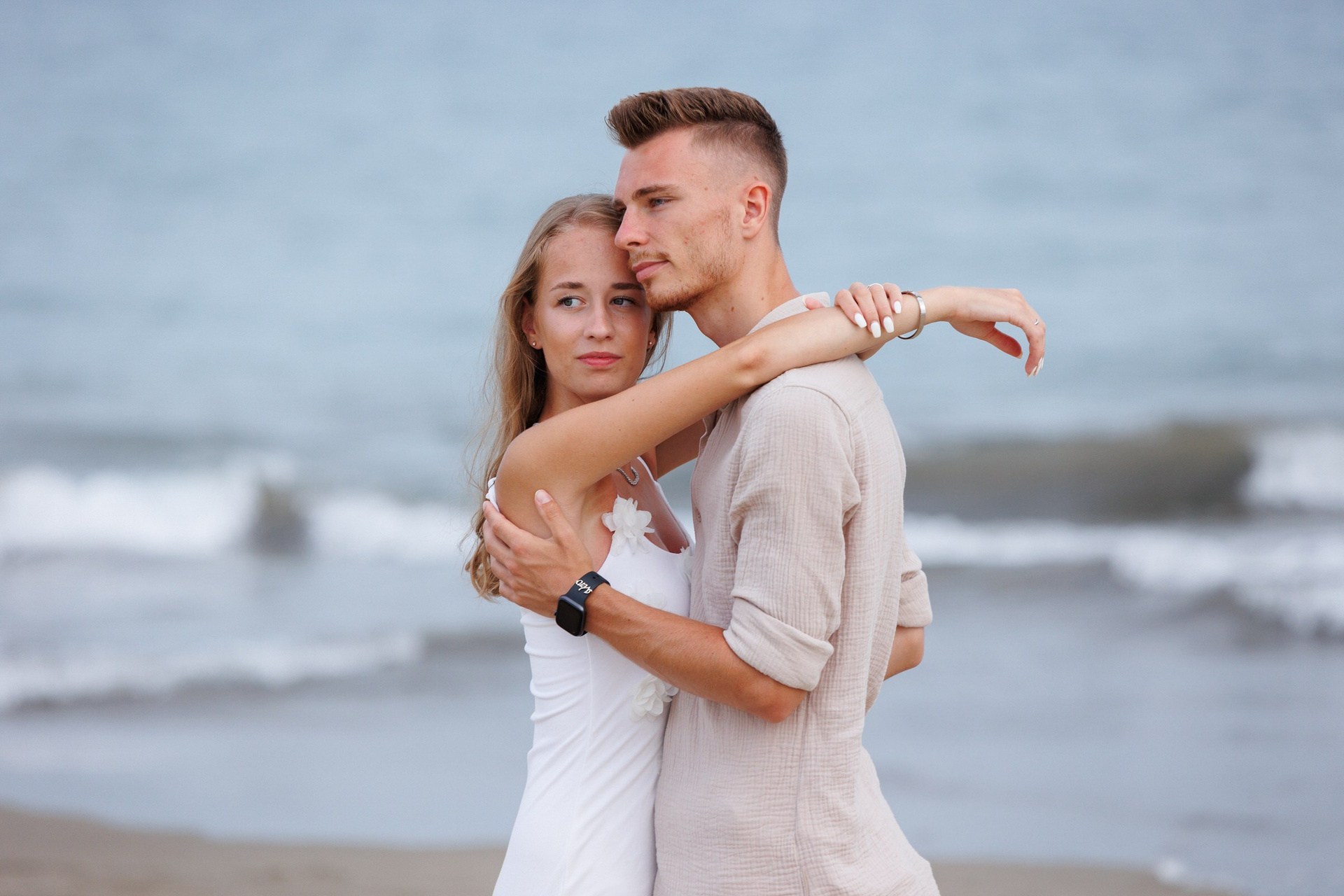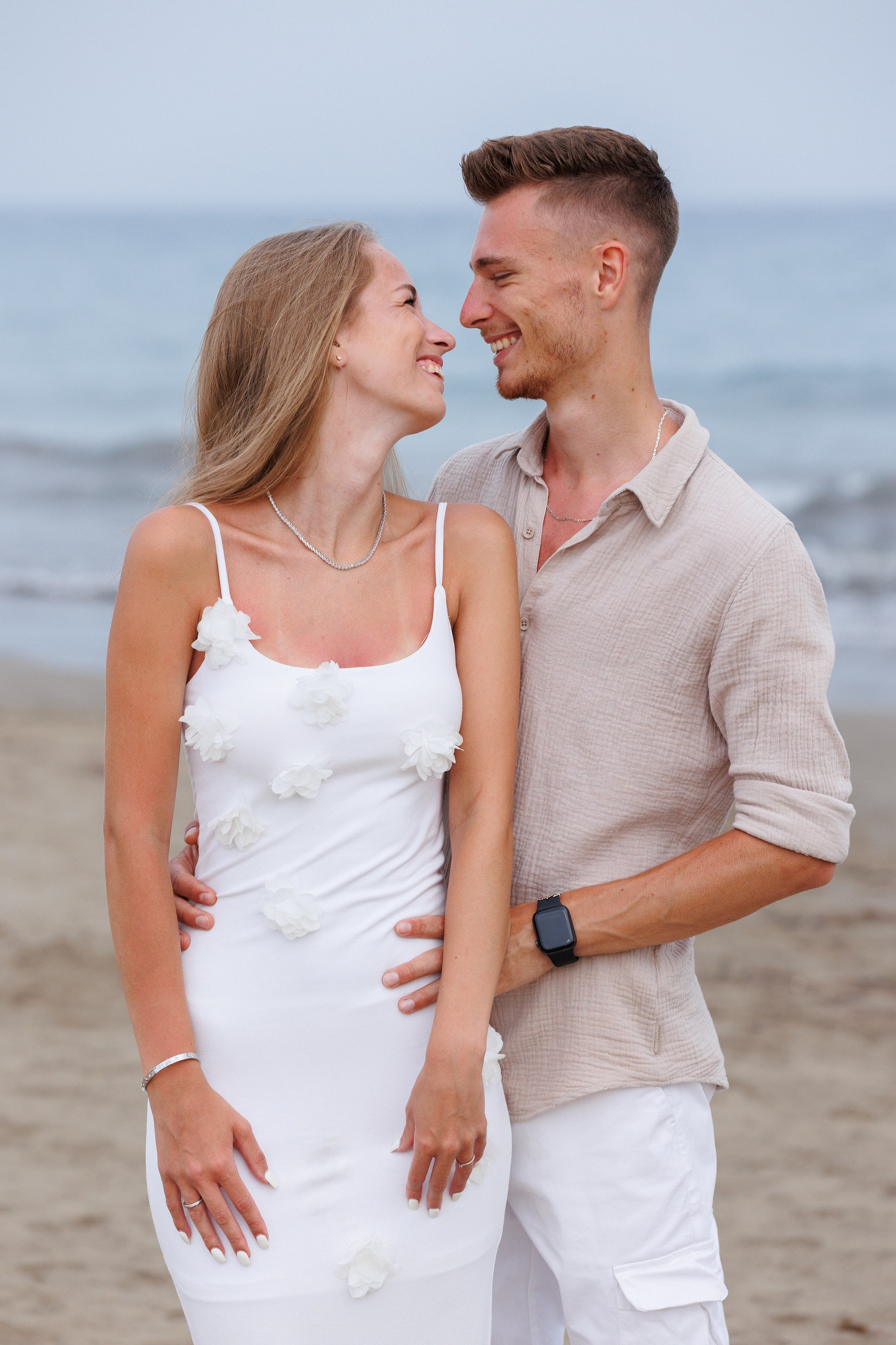 A sun-lit beach portrait of a happy couple in flowing attire, full of love and laughter, shot by Gran Canaria freelancer Slavik Robtsenkov during a romantic vacation.